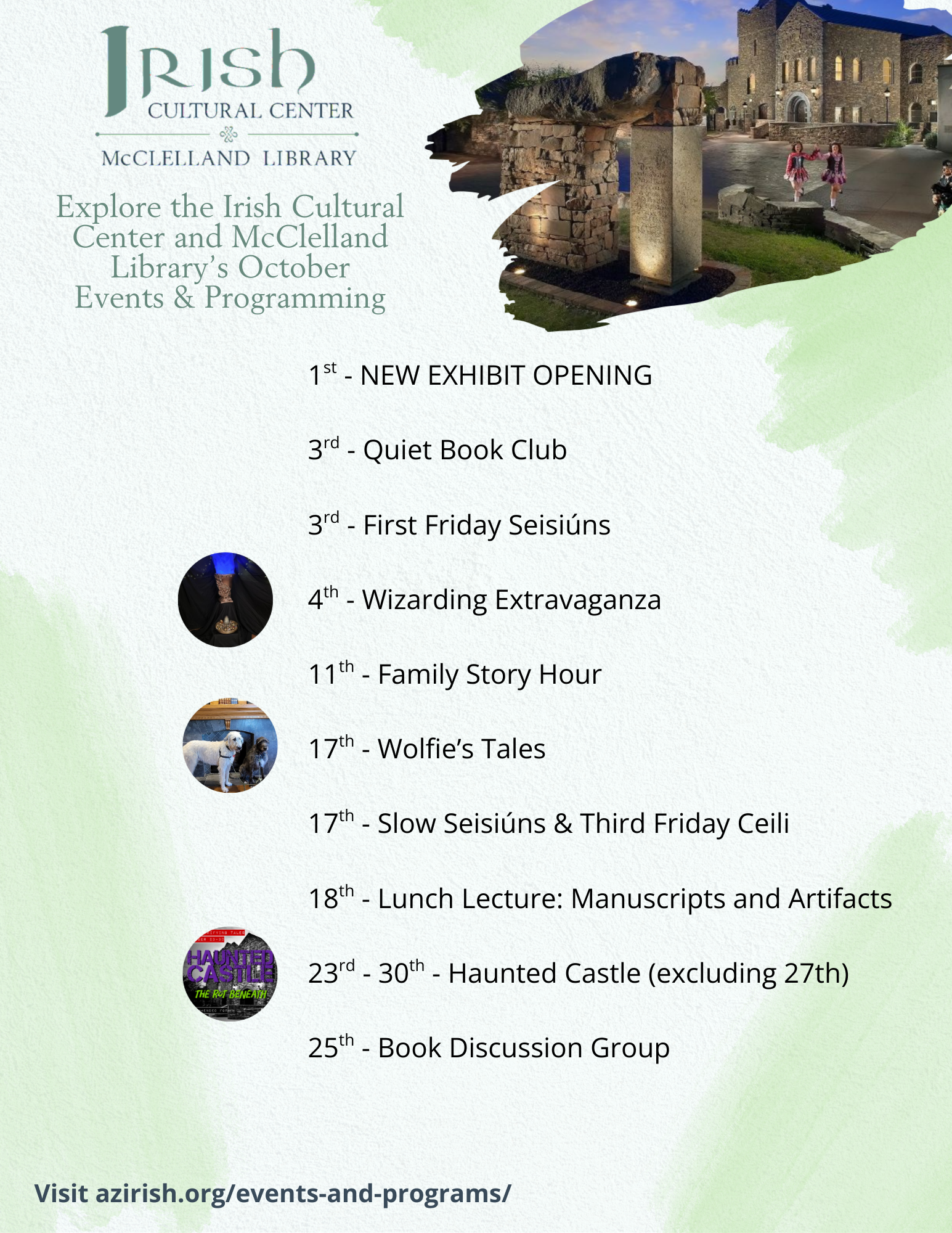 Haunted Castle: The Rot Beneath Get Your Tickets Anam Cara Gala – Saturday November 8, 2025 🎟️ TicketsGeneral Admission – $250VIP Experience – $500 Cocktail Reception | 6:00 PMDinner & Gala Program | 7:00 PM Get Your Tickets Now New for Samhain...Researching the 'Passed' Genealogy ClassNovember 1, 2025ICLF members – $20General Admission – $30 Learn More Here Fall Family Story HourSeptember 13th, October 11th, November 15th and December 13th at 10:30am Learn More Here Donate to our Mission We bring Irish heritage to life through dynamic education, vibrant community events, and the celebration of cherished traditions, inviting people of all cultures to connect, learn, and carry the Celtic spirit forward. Give Here 2025 Calendar of Events & Programs (updated 8/29/2025) Upcoming Event/Programming 10/17/25 Wolfies Tales in Phoenix, AZ at Castle Keep, in the McClelland Library More info & Tickets 10/17/25 Third Friday Ceili in Phoenix, AZ at The Great Hall More info & Tickets 10/23/25 - 10/30/25 The Haunted Castle in Phoenix, AZ at Irish Cultural Center More info & Tickets 10/25/25 Book Discussion Group in Phoenix, AZ at Norton Conference Room (basement) More info & Tickets 11/01/25 Genealogy Workshop in Phoenix, AZ at McClelland Library Purchase A Membership Current Member Login Become a Volunteer See All Upcoming Events Anam Cara Gala Learn More Genealogy Find Your Family… Research Weddings More Info Emigrant Support Learn More